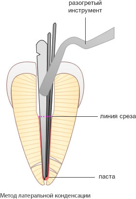 Сущность метода состоит в том, что корневой канал плотно заполняется гуттаперчевыми штифтами в сочетании с твердеющей пастой. При этом достигается очень надежное закрытие апикального отверстия и полноценное заполнение всего просвета корневого канала.