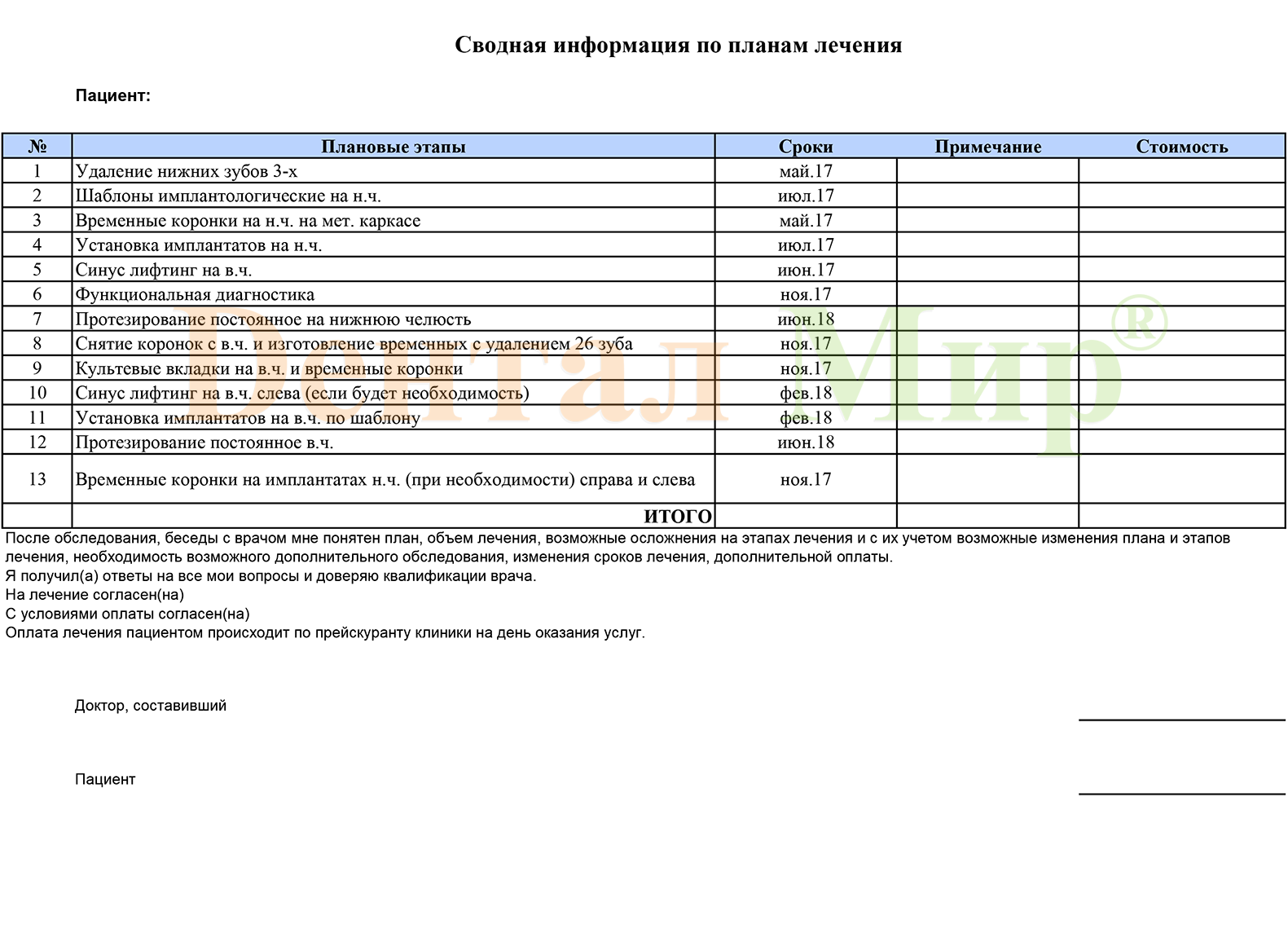 Ниже приведен план лечения для имплантации и последующего протезирования зубов (планов лечения может быть несколько, в этом случае, наши специалисты предоставят вам также и альтернативные варианты).