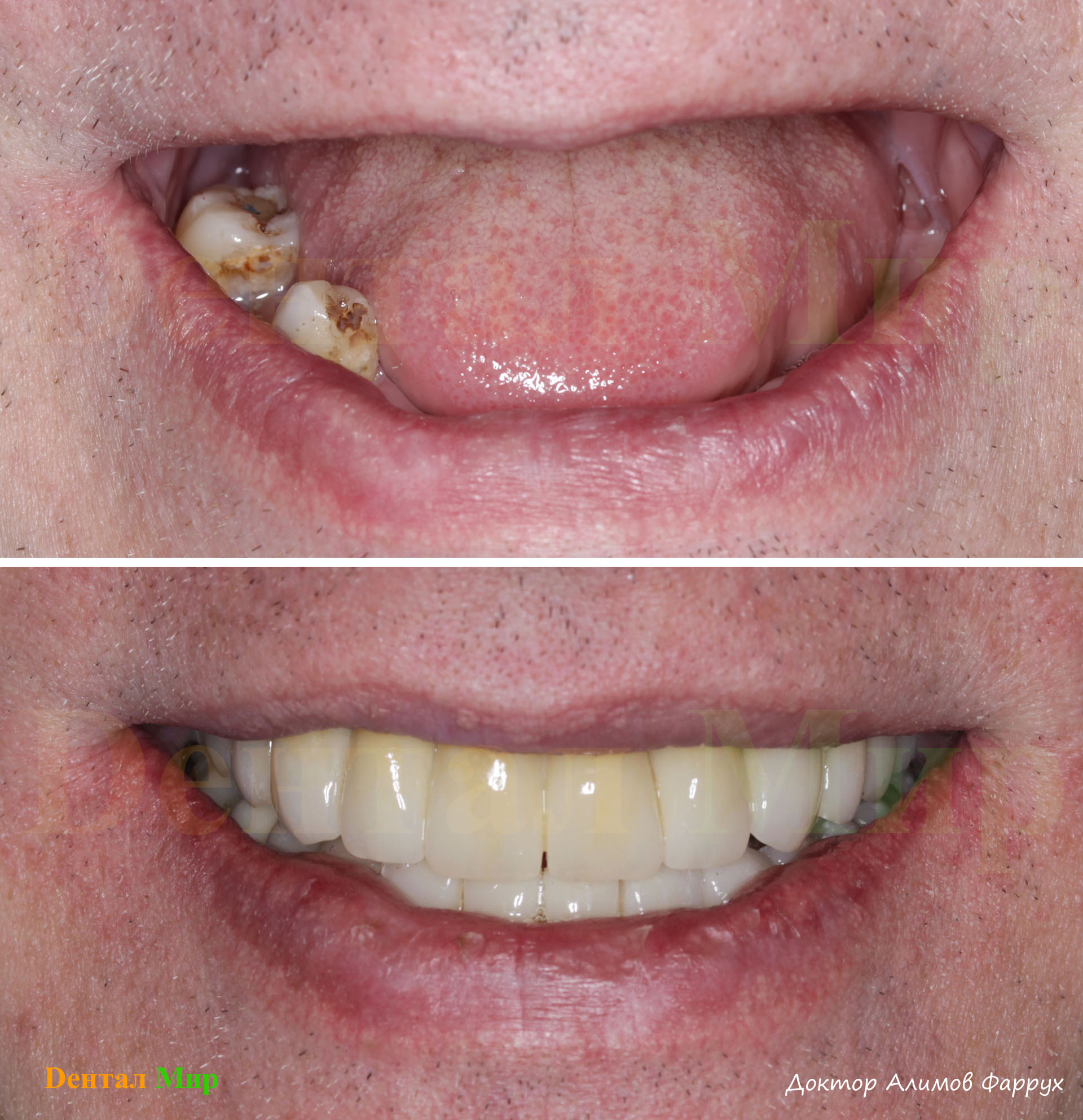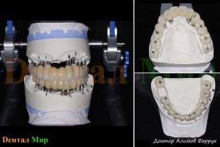 Имплантация зубов проводилась с импользованием навигационных шаблонов. После установки имплантов был изготовлен съемный протез, для того, чтобы на время заживления и остеоинтеграции пациент не ходил бы без зубов.