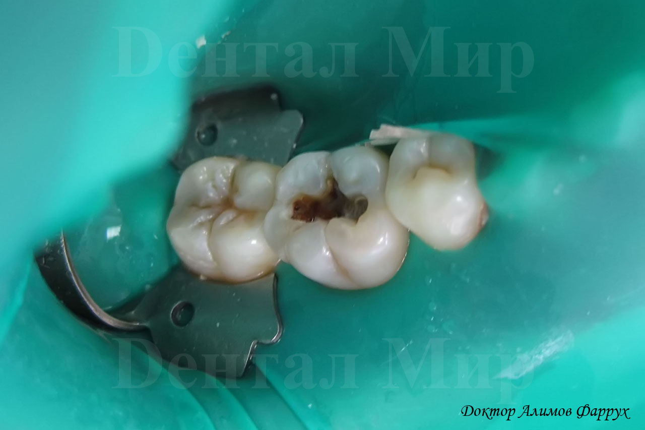 После начала препарирования становится ясно, что речь идет уже о среднем и даже глубоком кариесе