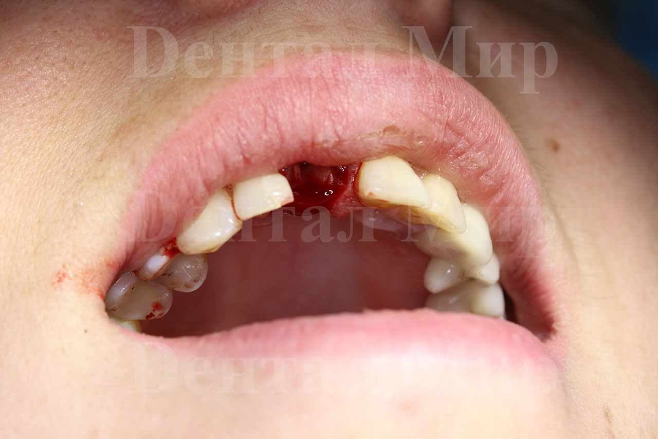 На фото – корень зуба был только что удален. Планируется одномоментная имплантация и установка временной коронки.